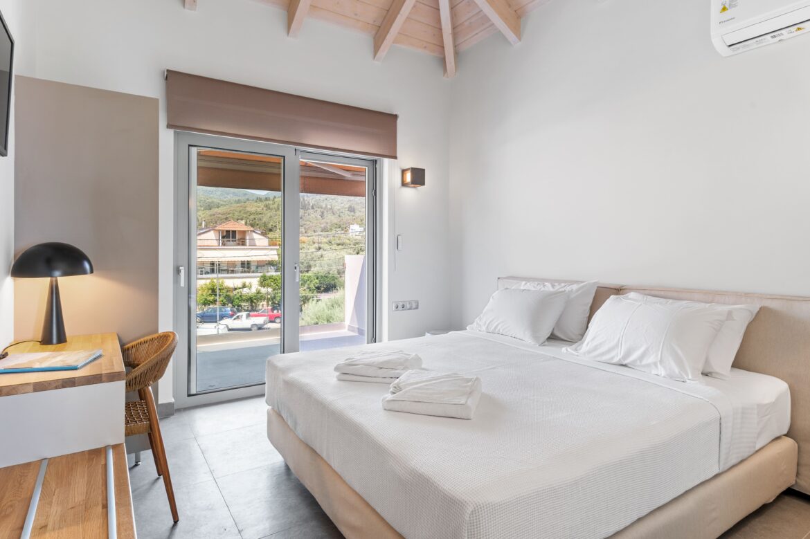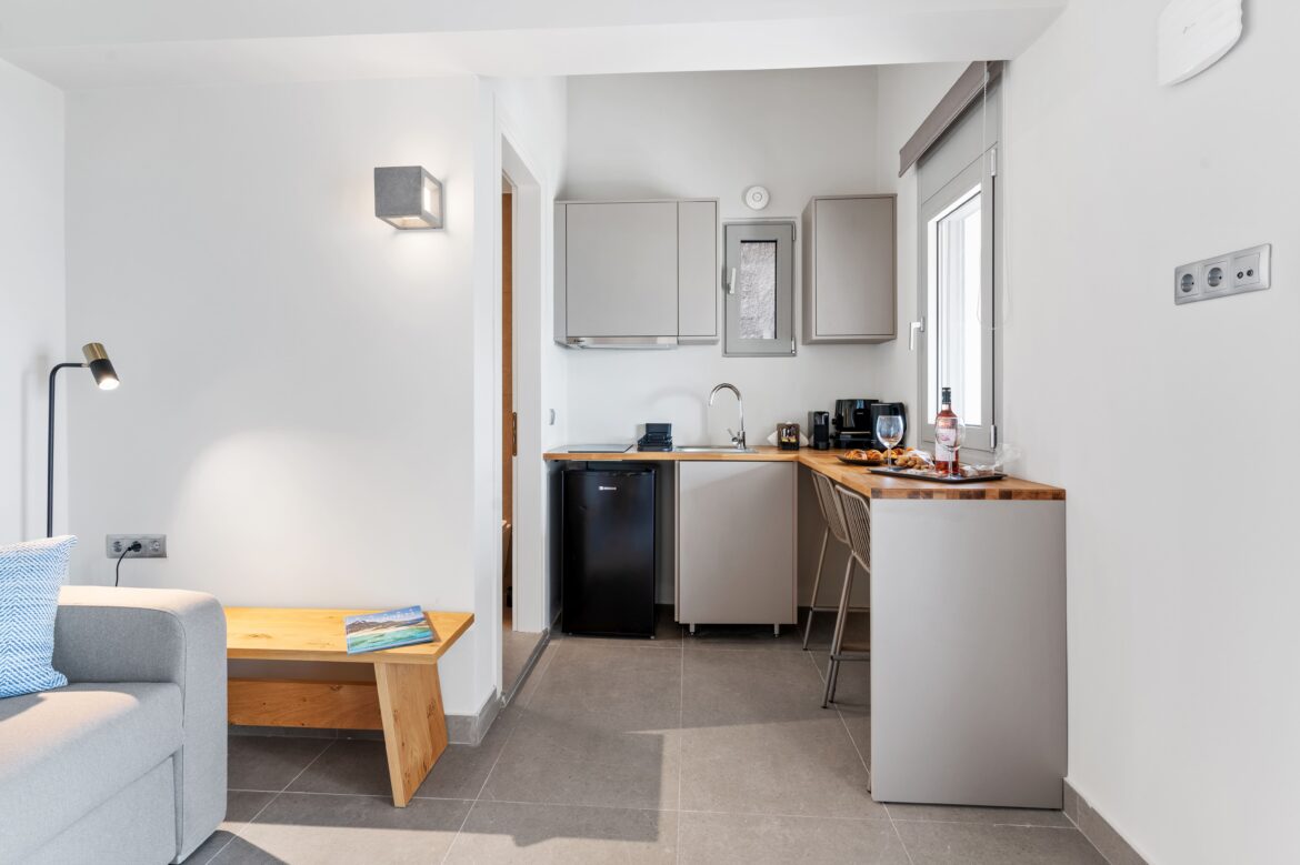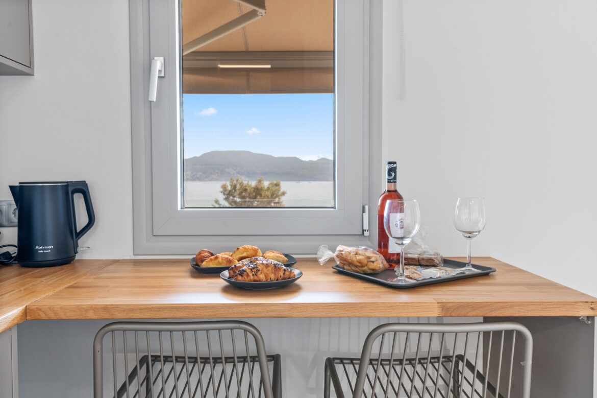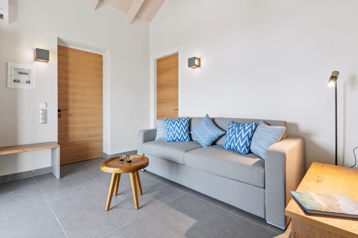 An exquisitely decorated one bedroom apartment with a harmonious aesthetic that creates a sense of privacy and intimacy. It has a comfortable bedroom with a Queen bed, a spacious living room with a couch bed and an equipped kitchen with hob , fridge, toaster and nespresso coffee machine. The balcony with a pool and a sea view is the ideal spot for relaxing moments! This apartment is a dreamy choice for a carefree summer escape!